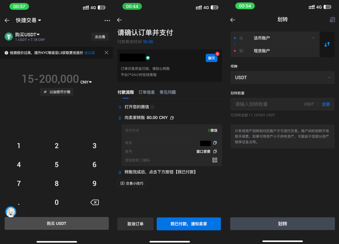 在快捷交易中以CNY计数下单,向币商发送相同金额的红包后通知卖家,通常交易在一分钟之内可以结束。