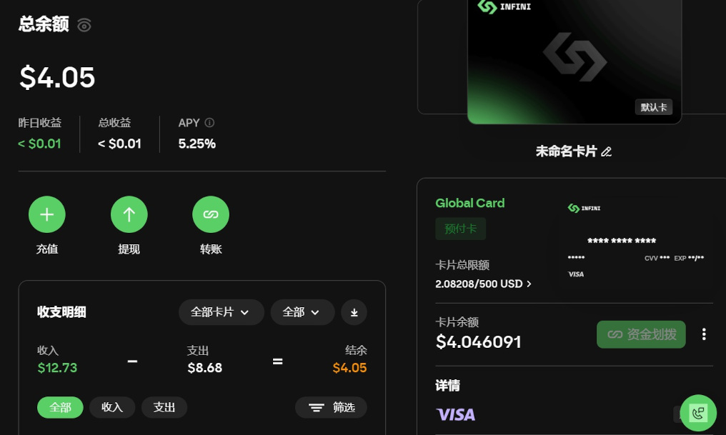 U卡就是指可以用USDT这类稳定币进行充值,然后像普通银行卡一样在支持相应卡组织(如Visa、Mastercard)的商户进行消费的卡片。这类卡片可选很多,不乏免KYC,低开卡费,较长年限的卡商。这里使用InfiniCard做充值演示,在未进行KYC的情况下,具有500U的限额。充值U卡的过程实际上是从交易所提币。