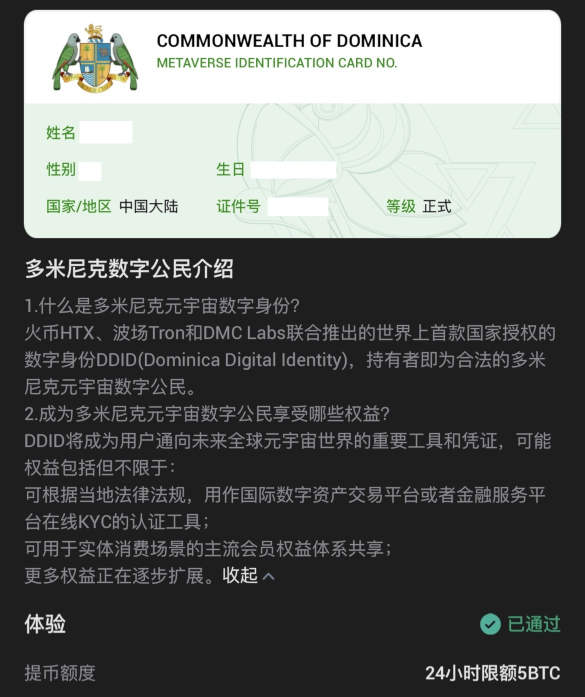 最终目标锁定在火币HTX,恶名昭著的孙割对KYC的管控意外的宽松——在其他交易所还在用前摄对韭菜们的大头用五颜六色的彩光一通羞辱时,我们伪大的孙割不仅只要求你在网上给他随便找来一串毫无价值的身份证号,还附赠你全套多米尼克数字公民身份,贡献乐子满满。到此为止便拥有了每日5BTC的提币额度,快谢谢孙割。