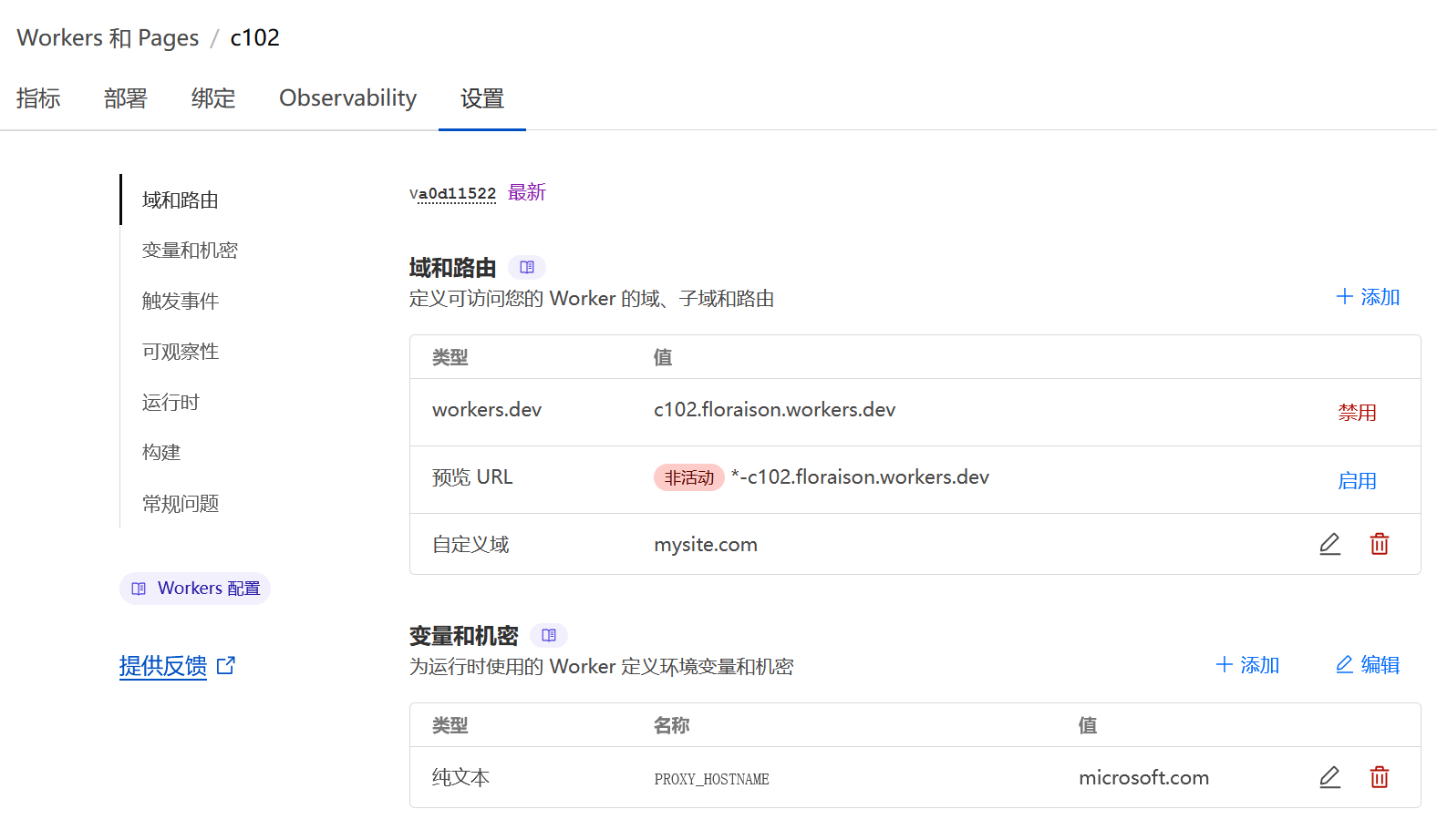 复制 workers.js 中源代码到 Workers 项目中部署后,还需为其配置所代理的域名:在设置中找到变量和机密,添加名为 PROXY_HOSTNAME 的变量,值为所代理网站的域名。同时自定义域需要填写自己托管在 CF 之上的域名。