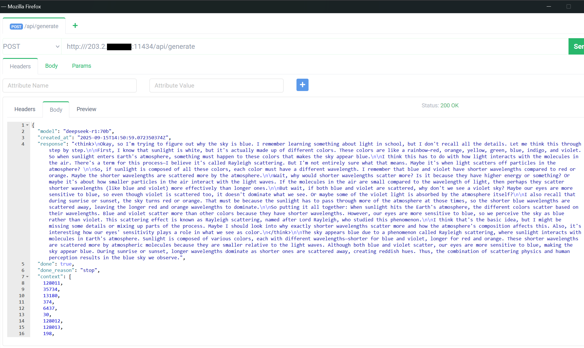 1 | {"model": "deepseek-r1:70b","prompt": "Why sky is blue?","stream": false} |