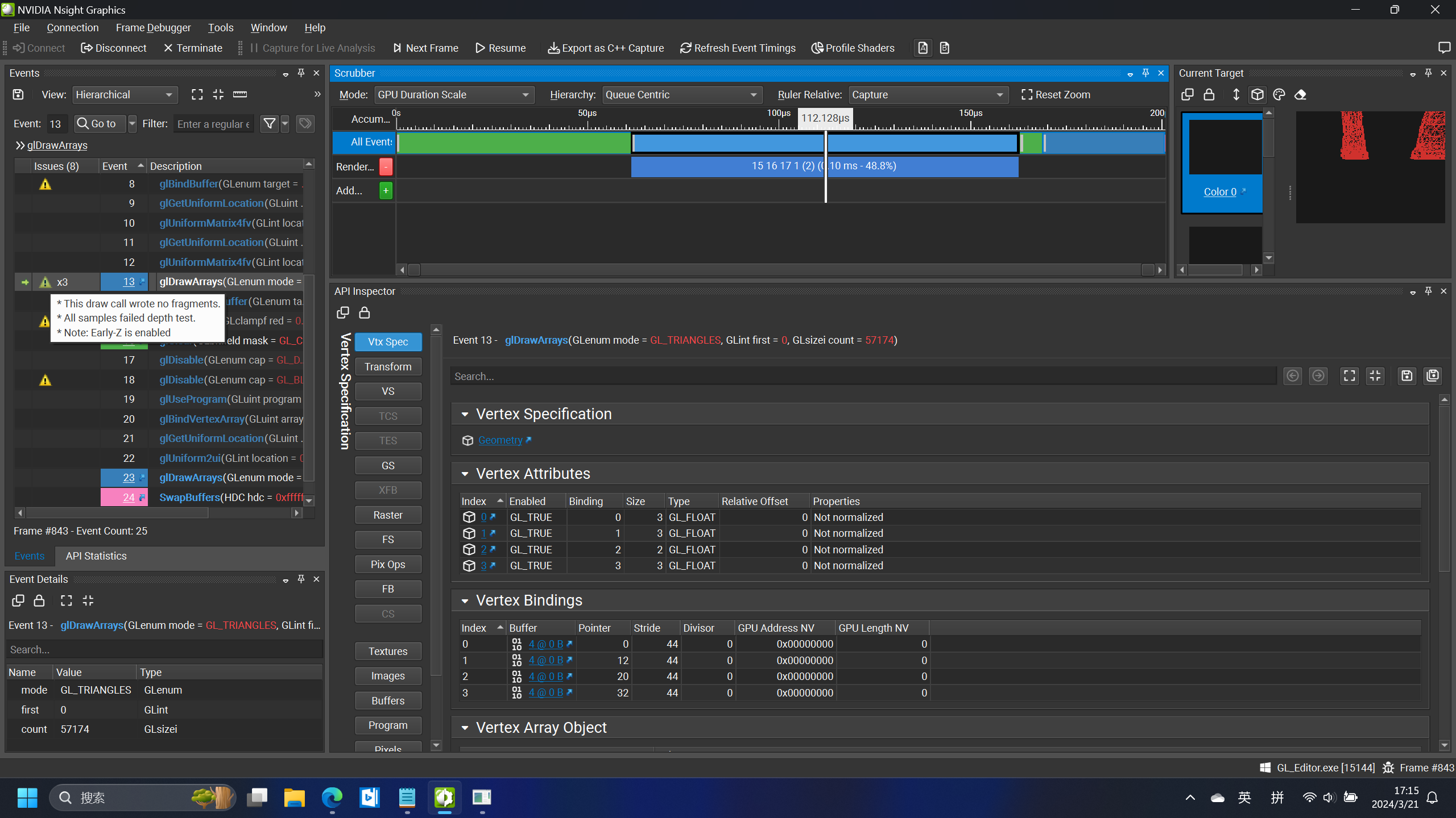 所有 API 调用都被按照执行次序依次排列在事件栏,我们具体关注 Warning 和 Error。可以看到在第13次调用时,NSight 提示本次 Drawcall 什么都没画出来,所有片元都提前死在了深度测试上。。。于是便破案了:深度缓冲没清屏,所有的像素值都是1,代表近裁切面,于是后续所有渲染尝试都挂在这里了。(大腿拍烂ing)