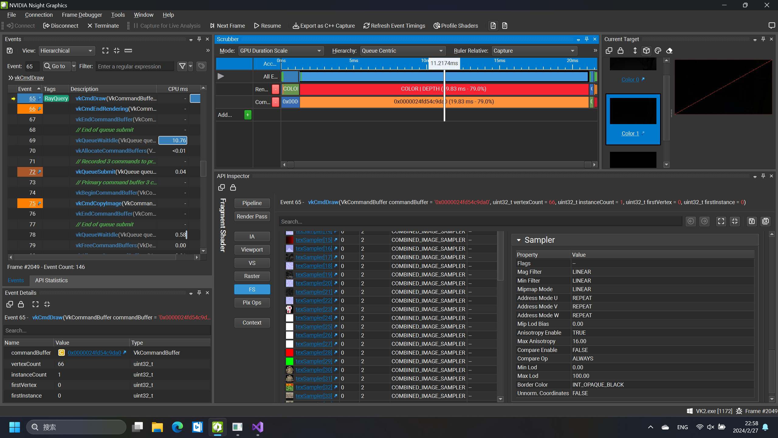 但更具体的问题是,帧生成时间的预算究竟花去哪里了?哪几趟 PASS 最耗时间?分析管线性能对后续选择优化方向十分重要,此处我以 Vulkan 图形程序做示范。