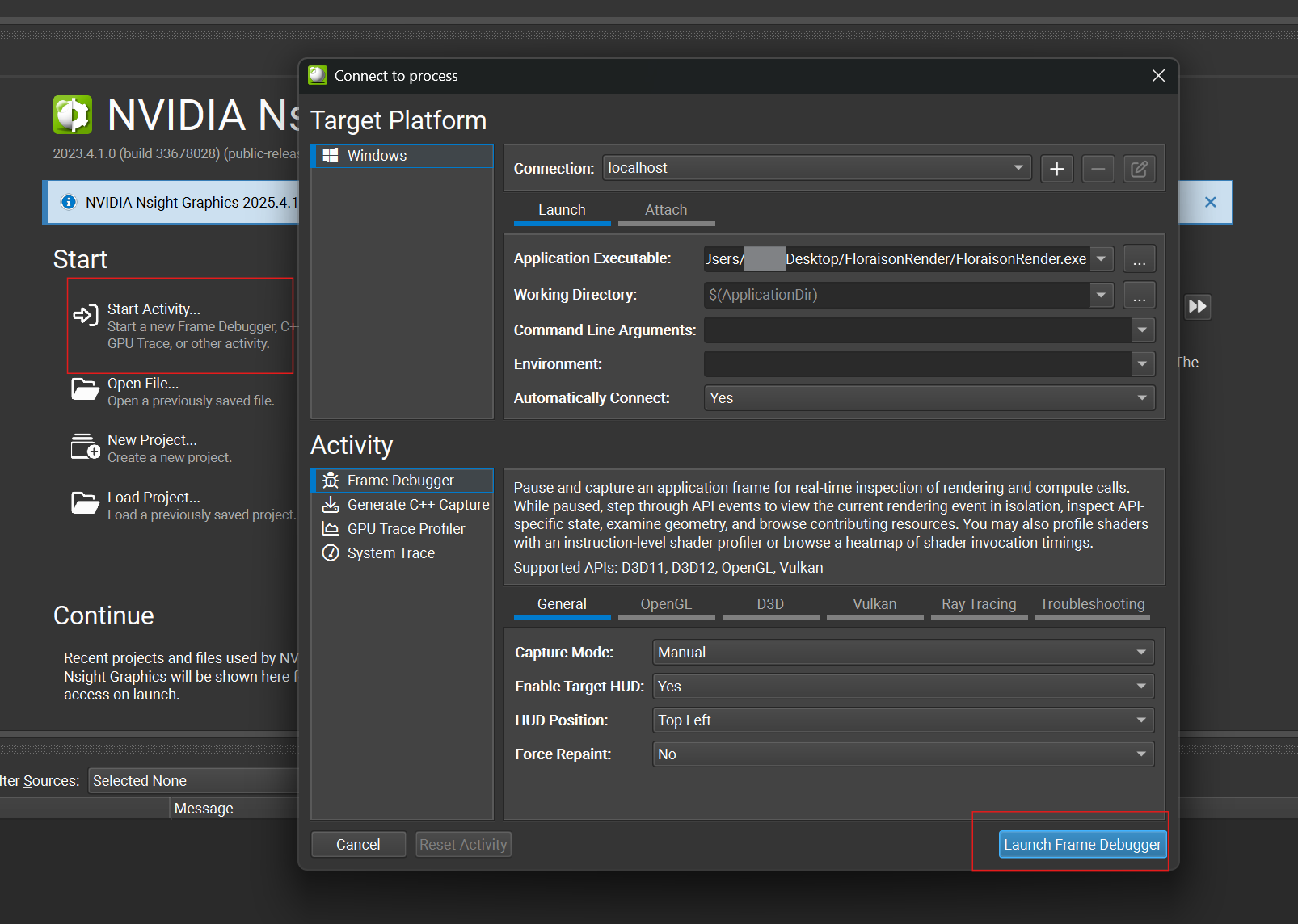 虽然 NSight 有直接依附进 IDE,比如 VisualStudio 的能力,不过还是建议直接绑定目标图形程序(项目 Debug 目录下的 .exe 文件),在欢迎页选择 Start Activity,选择图形程序的位置后就可以启动调试器。