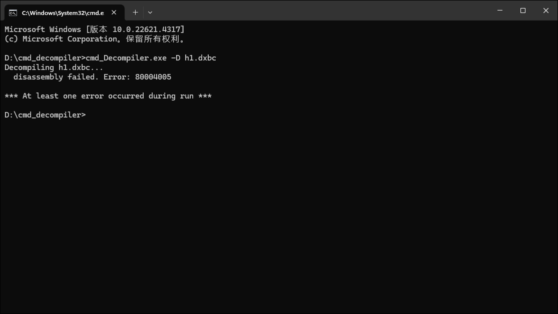 如果在反编译过程中报出代码 0x80004005 的错误,代表着精准踩进了坑。这行通用 Error 代码毫无任何信息含量,大概率之前在 RenderDoc 中集成的插件版也从来没遇到过。