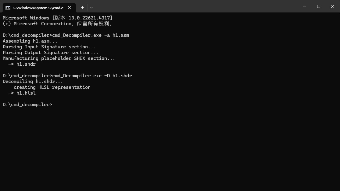 实际的反汇编顺序应为:DXBC -> ASM -> HLSL,而 cmd_Decompiler.exe 仅支持从 DXBC 二进制字节码向 HLSL 的直接转译。