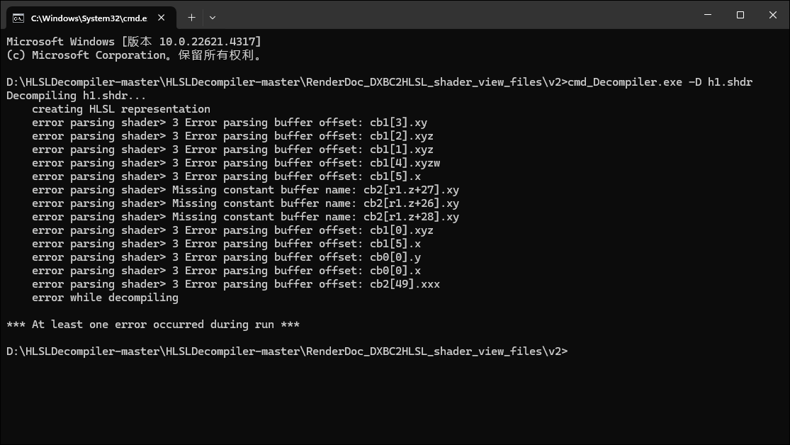 如果第二步从 dxbc 二进制字节码的过程中报出语法解析错误,代表此版 cmd_Decompiler.exe 尚未支持 SM5.0+ 的语法特性,然而此项目的着色器大量使用 SM5.0+ 的语法特性。