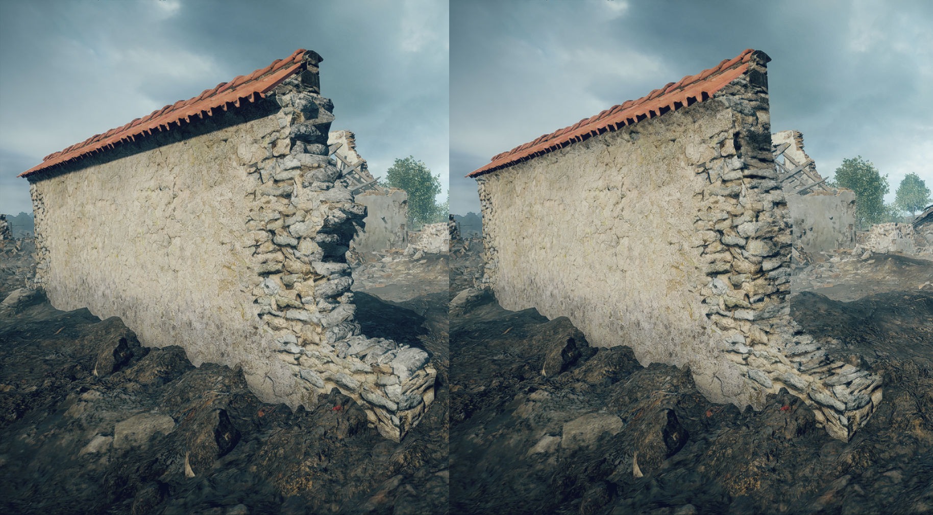 这使得破损处的纹理自然连续,如果墙角被炸坏,由于 3D 体积是连续覆盖在此区域的,破损纹理会自然包裹住拐角。