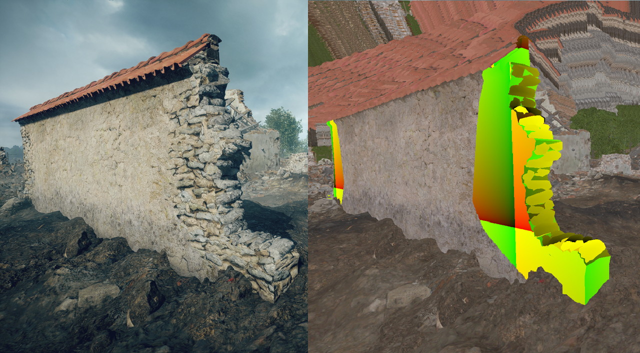 此处解决破损后的纹理贴图问题:当墙面碎裂露出内部结构(如砖块、钢筋、木片)时,由于没有为破损处额外预先制作 UV,寒霜根据其在世界空间的位置决定最终的纹理坐标,以保证纹理在切口处两侧模型上的连续性。