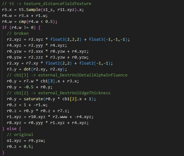着色器中,此处的顶点属性 v6 使用 nointerpolation 属性非插值读入,确保一个三角面内的所有像素都使用相同的破损纹理ID,不会出现半砖半水泥的奇怪渐变。