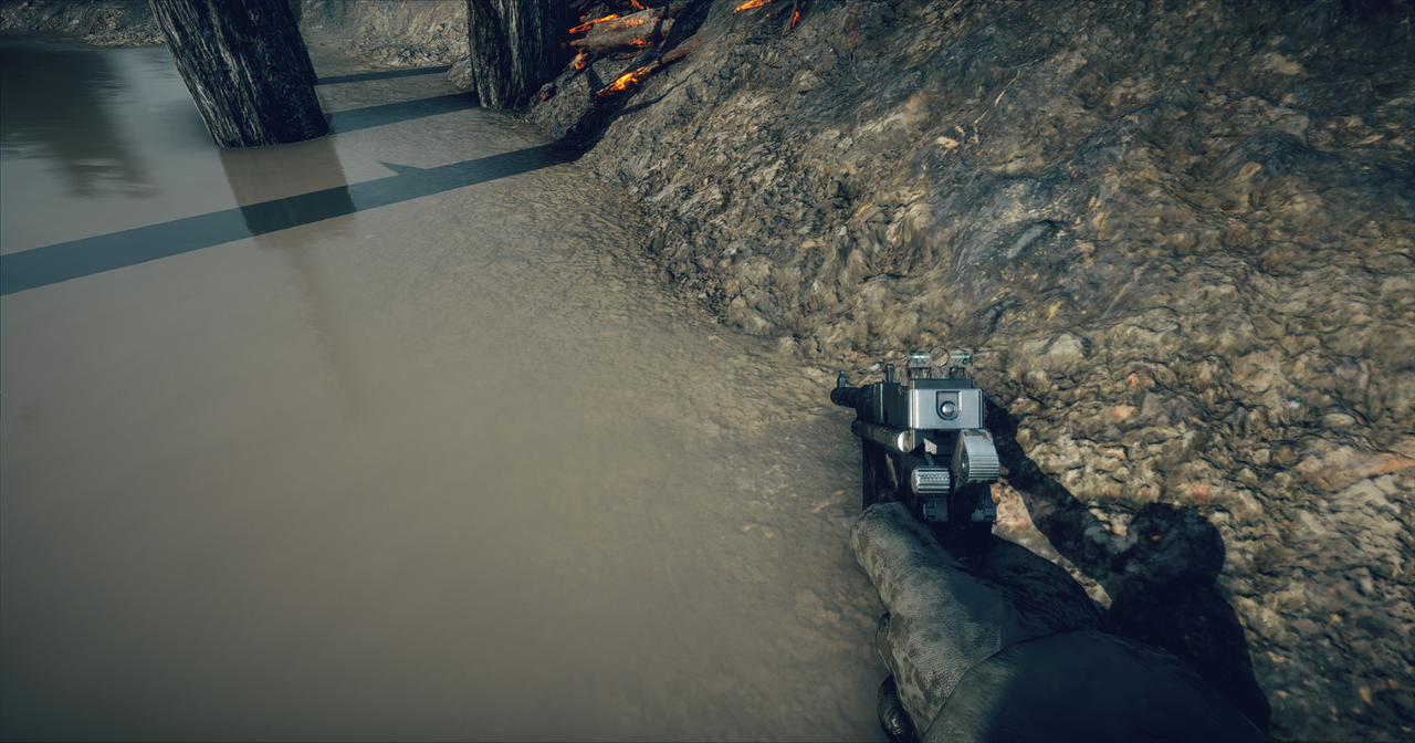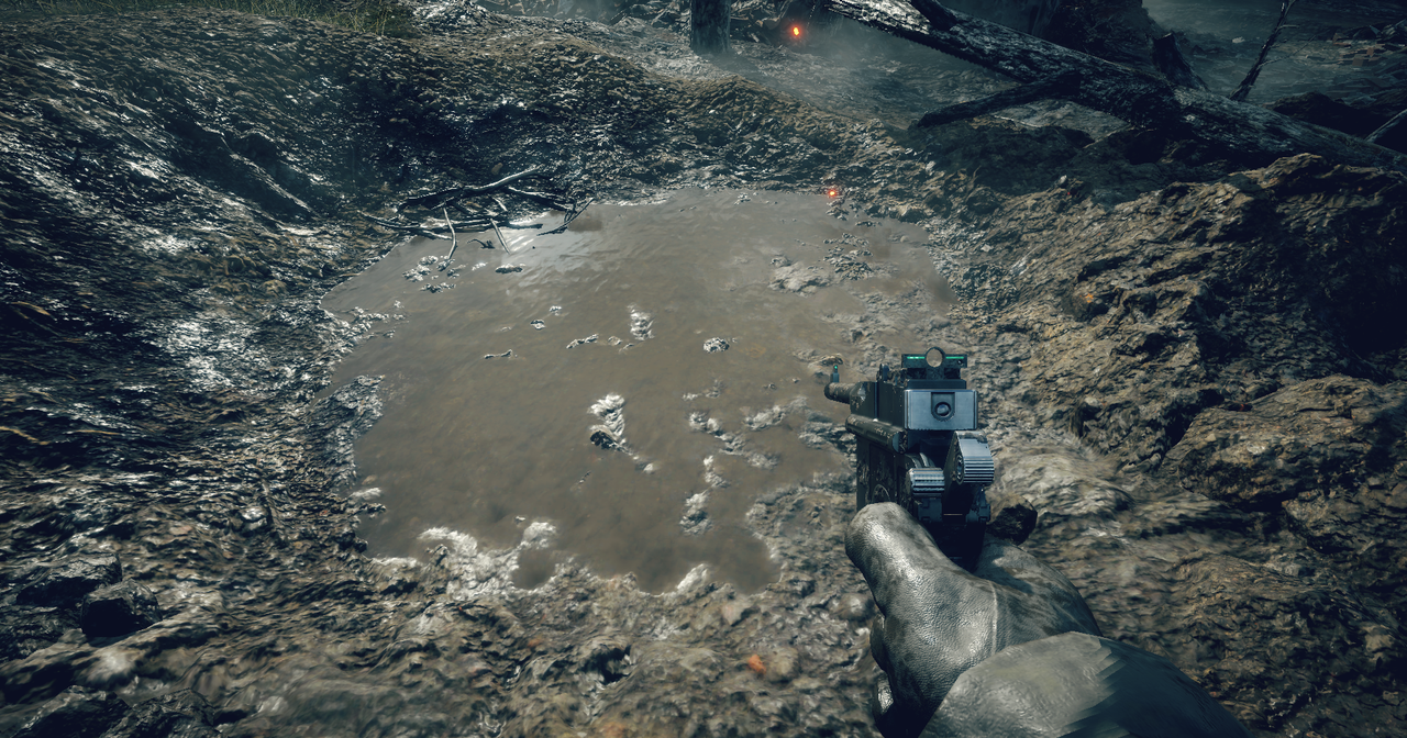 对于战地风云1,场景中的积水有两种实现:一种是刷在地形表面的积水,烘培进入地形纹理,是地形材质的一种变体。用于实现简单的、浅薄的积水,随着地形一并渲染。