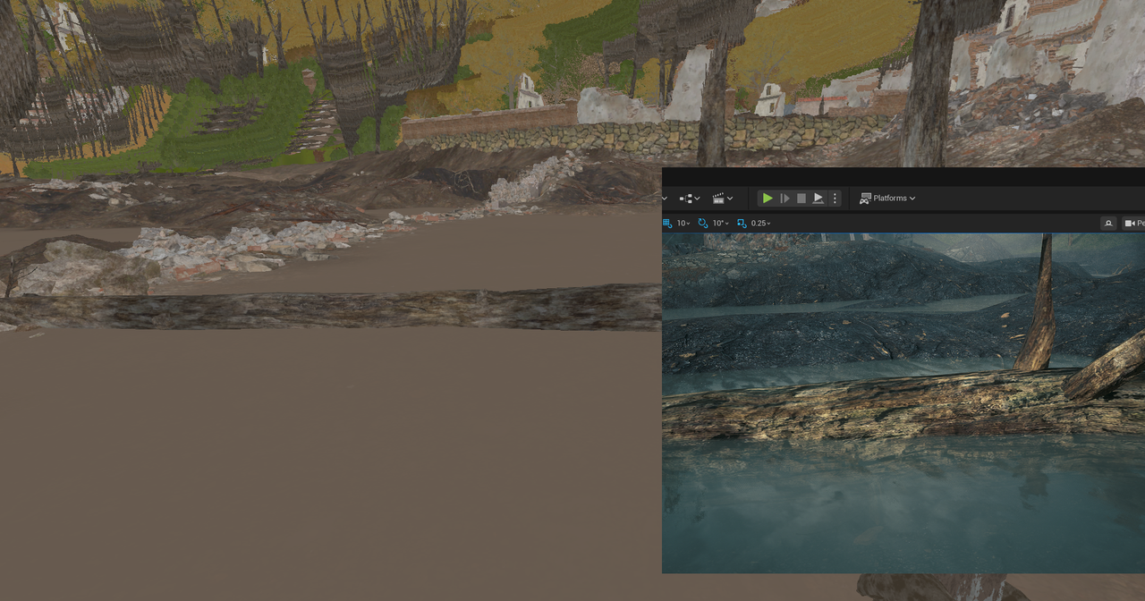作为地形材质的变体绘制,此类积水没有实际深度,中心处凸出水面的小块泥土与积水实为地形的一部分。以下是一块积水处的地形,为保持视觉上平整的水面效果,积水处的地形不启用置换纹理。