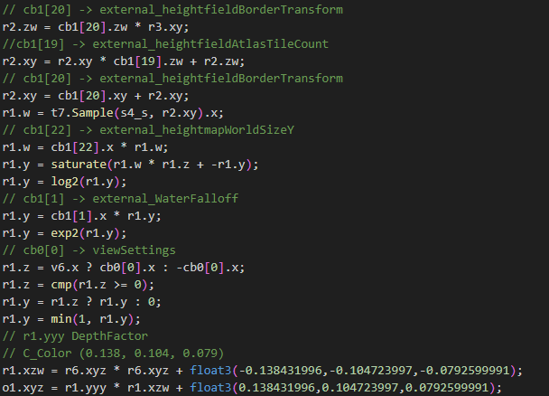 同时由于(直接将下方地形的纹理投射到水体表面)的做法,无法模拟水体在深水区因折射而产生的视差,为防止穿帮,水体的深度衰减系数 external_WaterFalloff 被设置为极大。表现在视觉上:水体极其浑浊,光线在水体的穿透距离极短。仅有岸边的浅滩可以被最终折射至表面