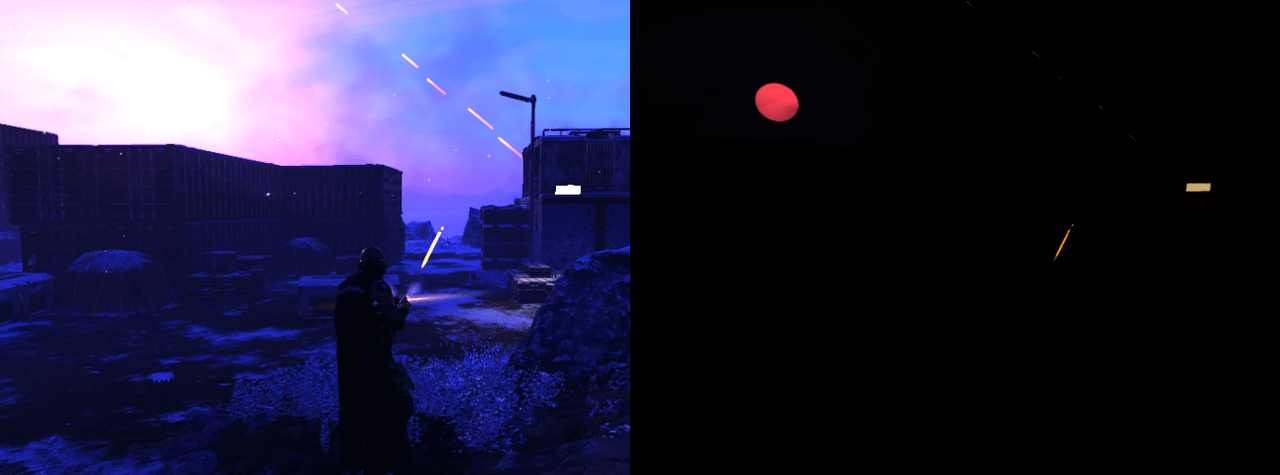 HD2 中的泛光效果不会对发光体的类型做特别区分,不使用卷积核构造泛光形状。直接通过对下采样 RT 的长宽限制,控制泛光形状,所有泛光在同一阶段完成,分为均匀泛光与水平方向的泛光。